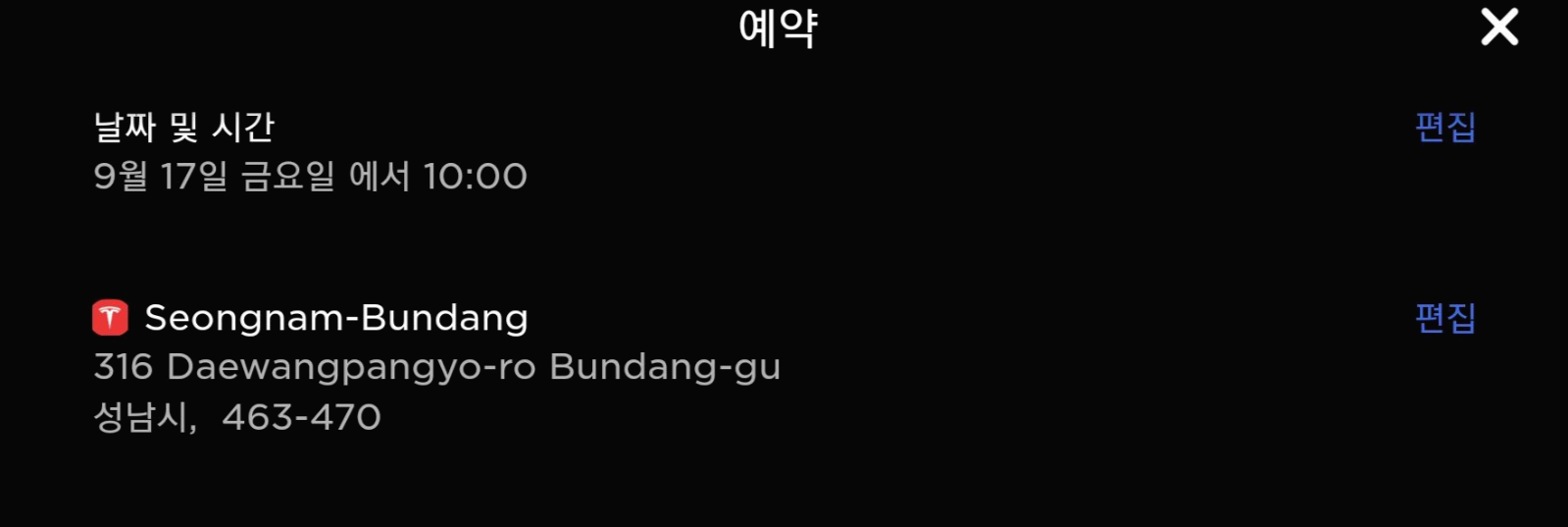 테슬라 모바일 어플에서 분당 서비스 센터에 예약을 완료하고 어퍼암 재고를 기다립니다.