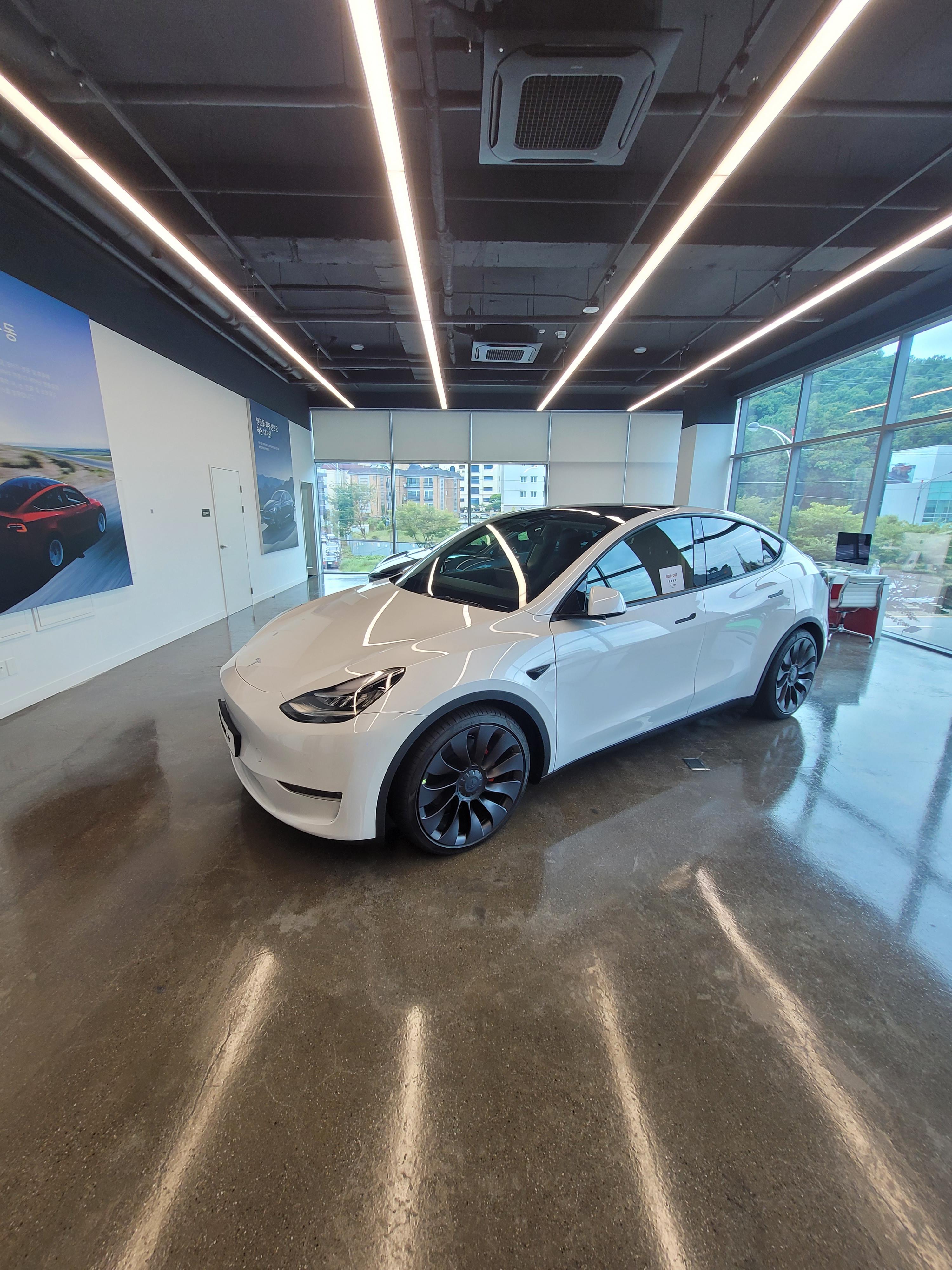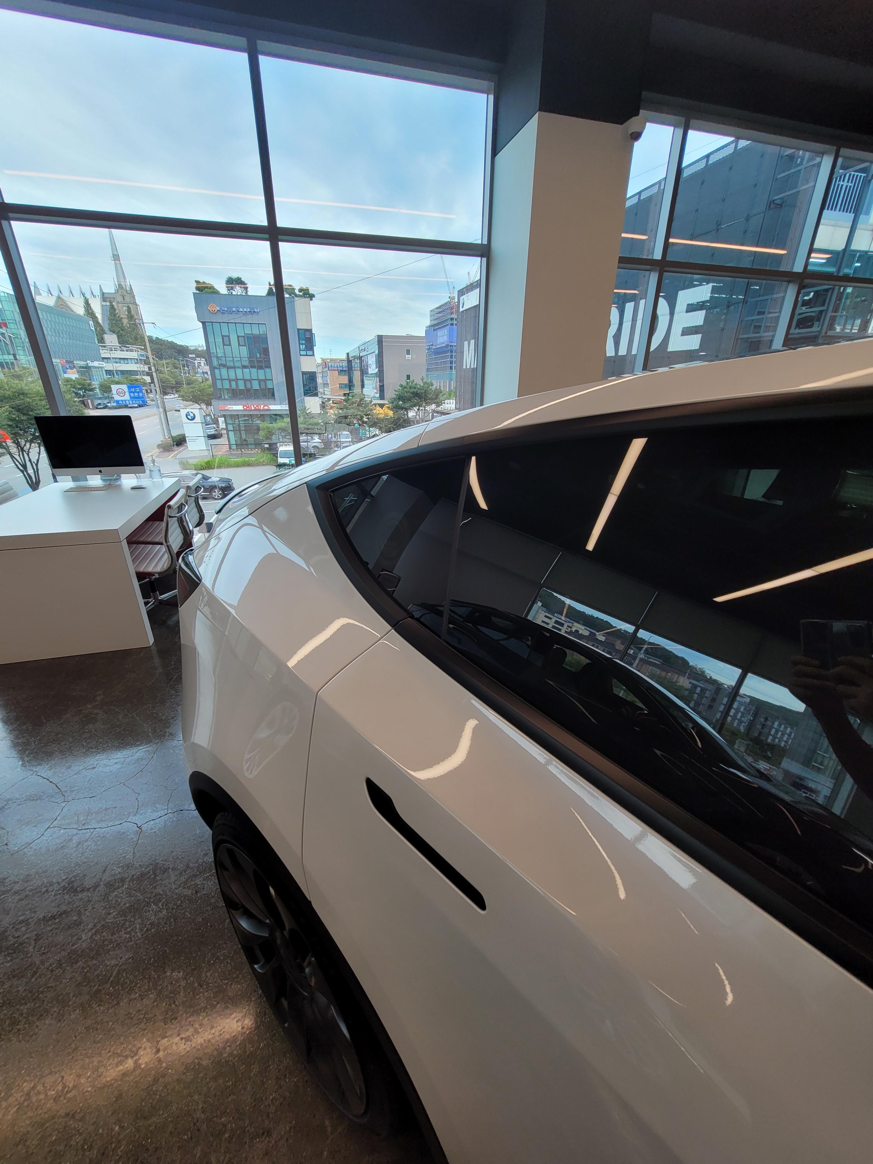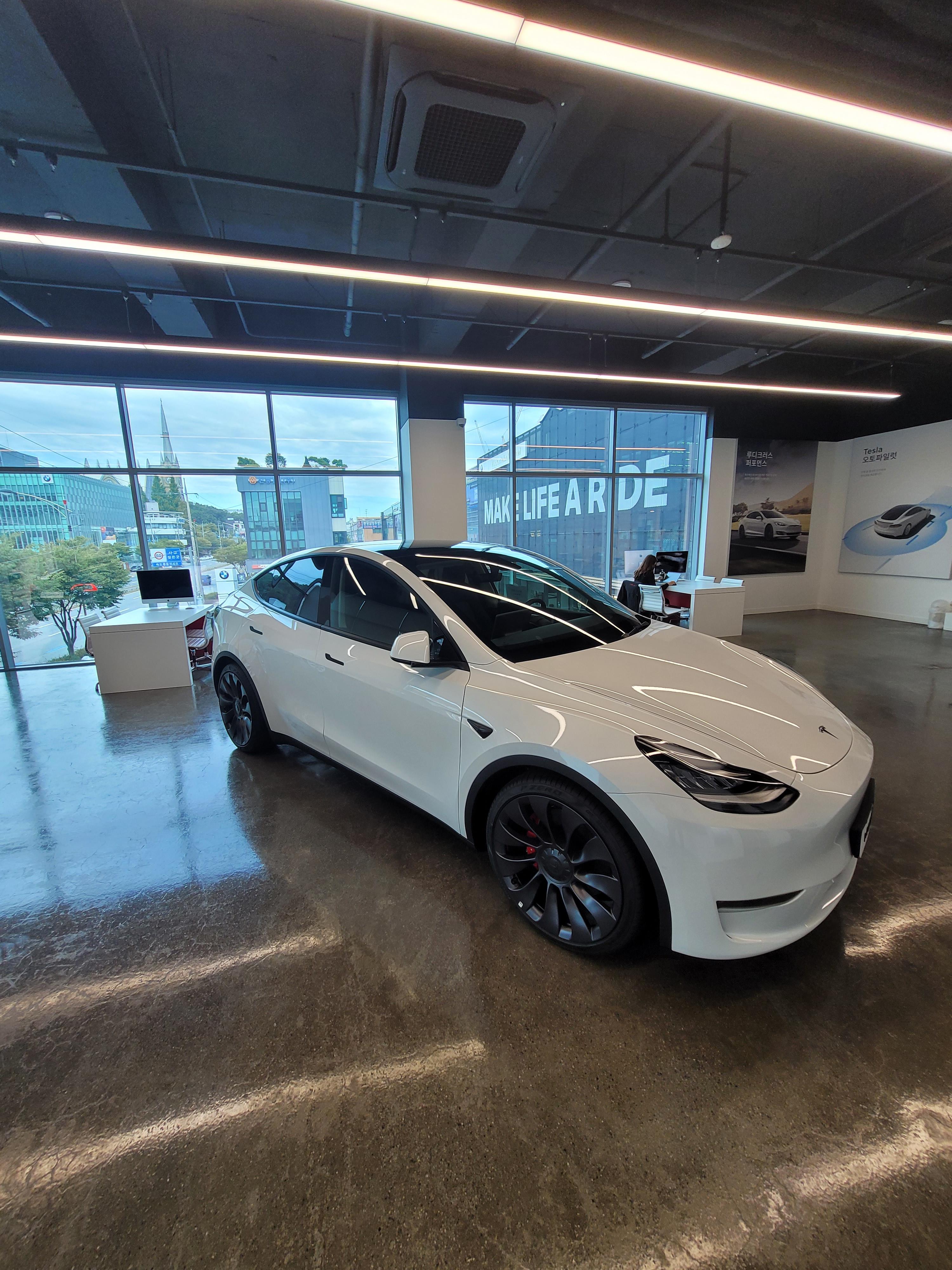 먼저 눈에들어오는 테슬라 모델 Y 퍼포먼스 차량입니다. 외부에서 간단히 둘러보고 있는데 어드바이져 께서 이 전시차량은 이미 판매가 완료된것으로 외부에서만 노터치로 구경만 해달라고 하네요 하하..