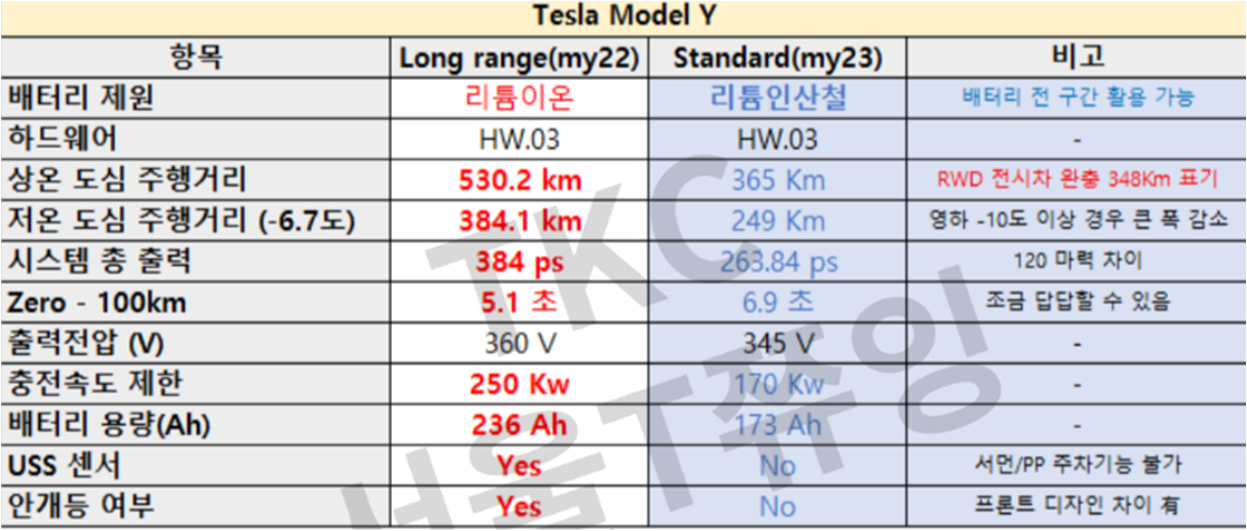 이전에 판매하던 모델Y Long 과 현재 중국에서 들여오는 모델Y 스탠다드의 스펙 구성 비교 Sheet 입니다.