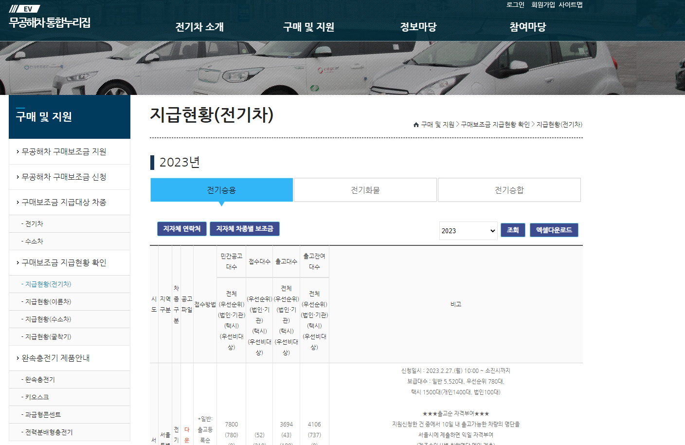 구매 및 지원 > 구매보조금 지급현황 확인 > 지급현황(전기차) > 전기승용 | 무공해차 통합누리집